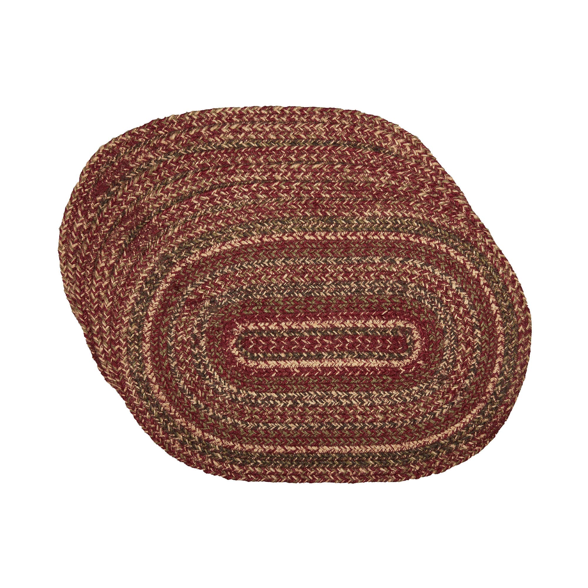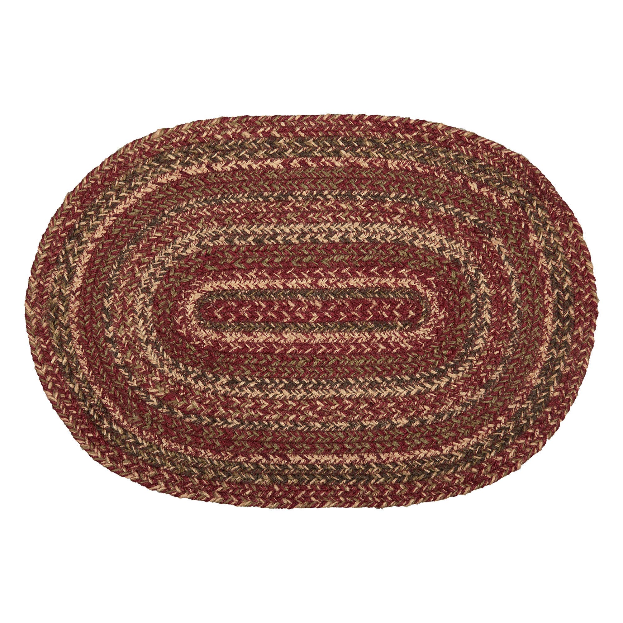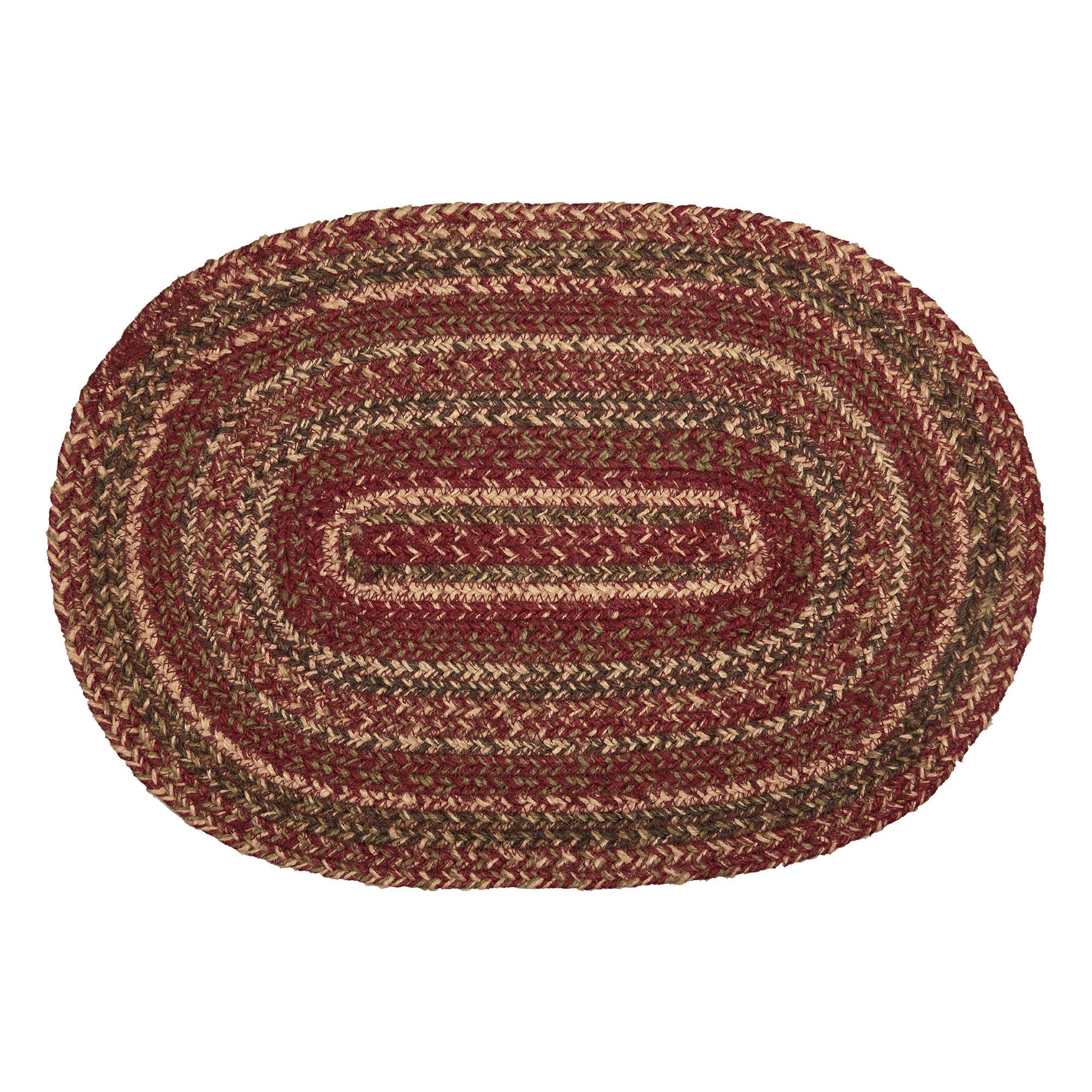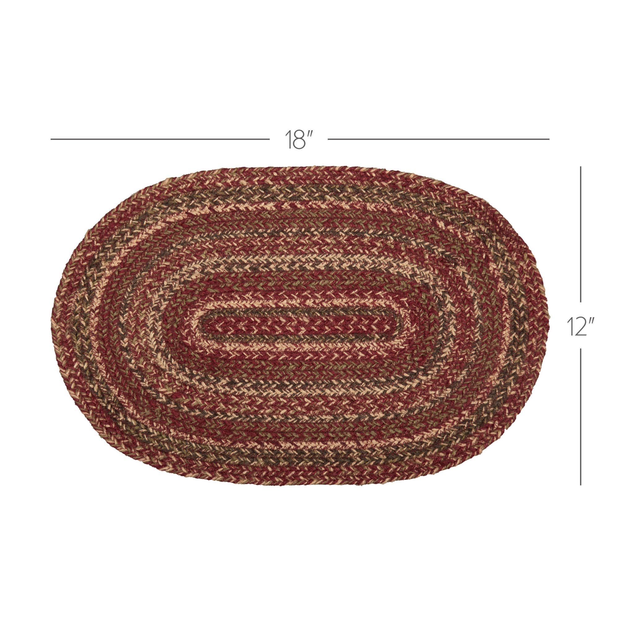 Create a warm, cozy table for friends and family to gather round on cold fall nights with autumnal tones and classic texture. The Cider Mill Jute Placemat measures 12x18 inches and is made from a premium Jute blend. The rich texture of braided jute is given a primitive country feel with burgundy, natural tan and olive green tones for a casual style.