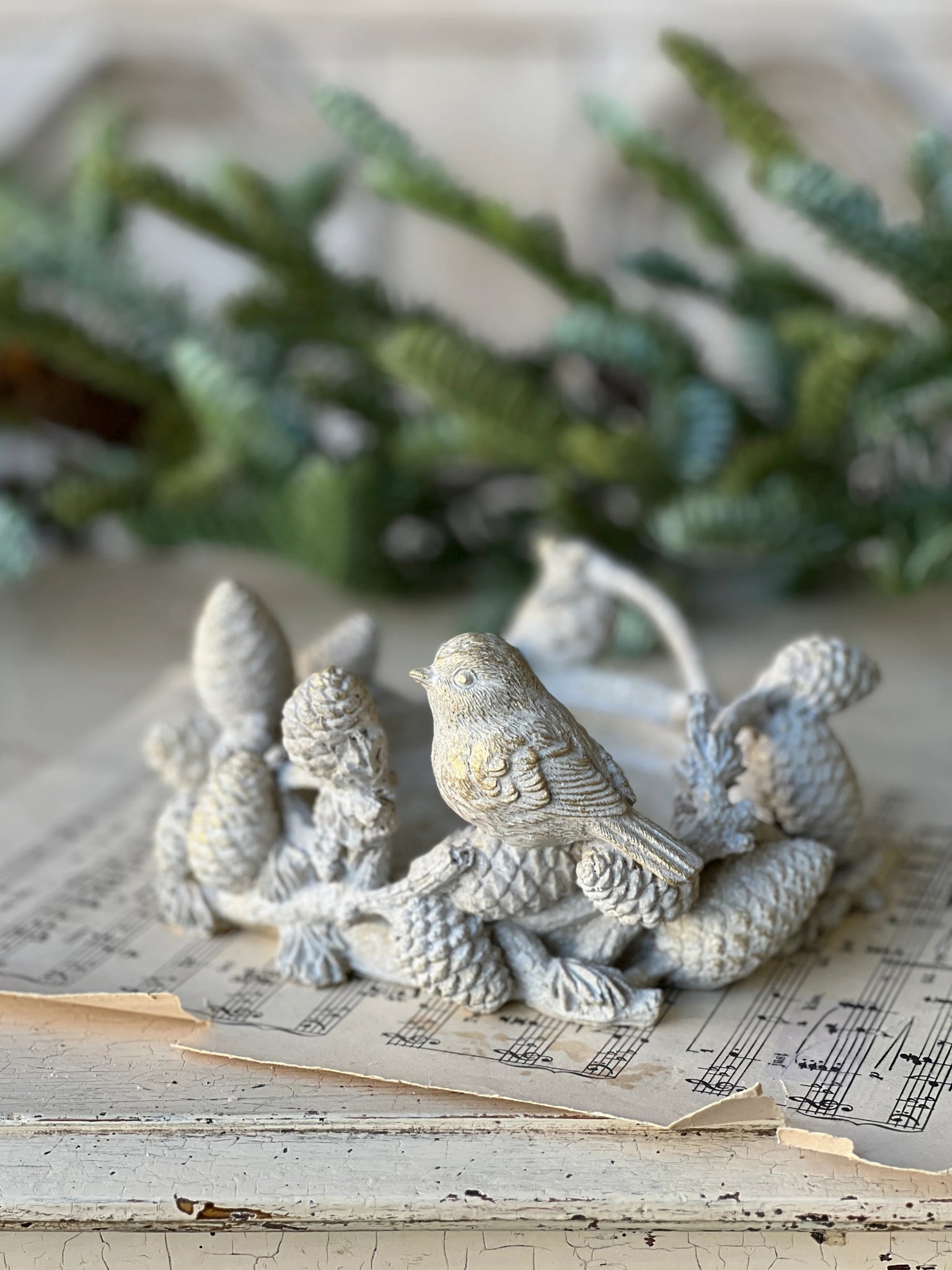 This Feathered Woods centerpiece brings a woodsy, natural element to your decor with its pretty gilded/whitewashed finished birds in a woodland setting.