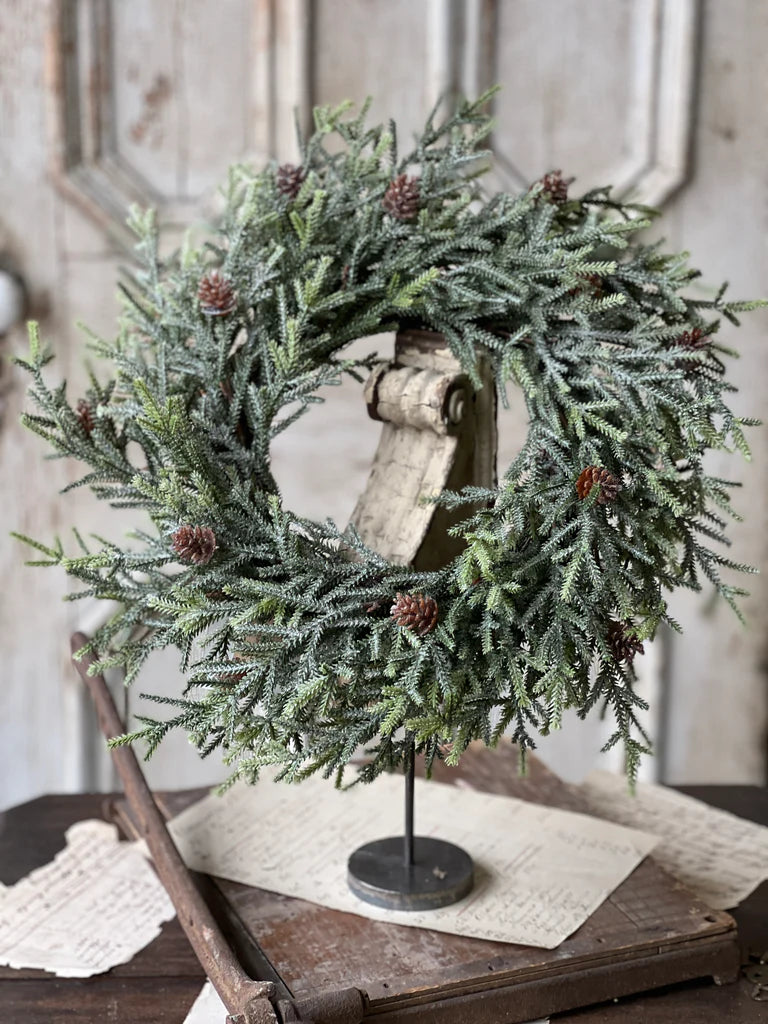 An ultra fine dusting of snow and glitter top these structural juniper branches.  Small pine cones are peppered throughout the greenery.