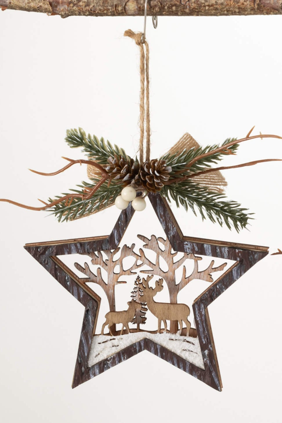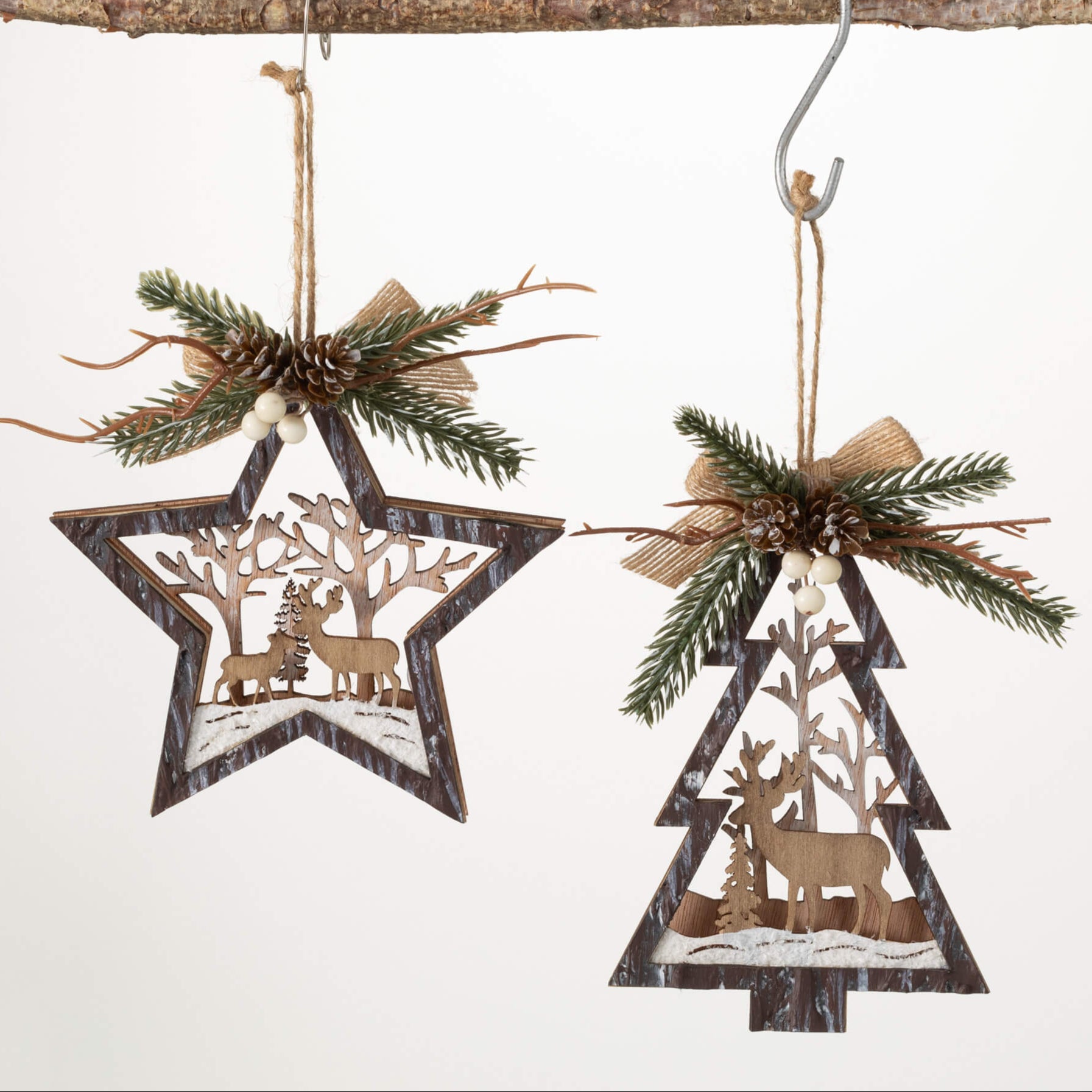 These delicate wood ornaments feature elaborate carvings of classic holiday scenes. Topped with faux greenery and a rustic bow. Choose from a star or tree. Makes great gifts.